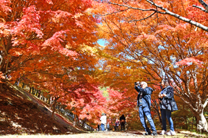 紅葉の名所として知られる箕輪町の箕輪ダム「もみじ湖」一帯で、モミジの色づきが深まっている。赤や黄、緑の葉が織りなす美しいコントラストを楽しもうと、連日多くの人…