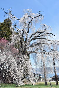 岡谷市湊の花岡区にある船魂神社で、枝垂れ桜が見頃を迎えた。2006年「七月豪雨」で、土石流から下流の住宅地を守ったとされる古木。災害から20年を迎えることしも…