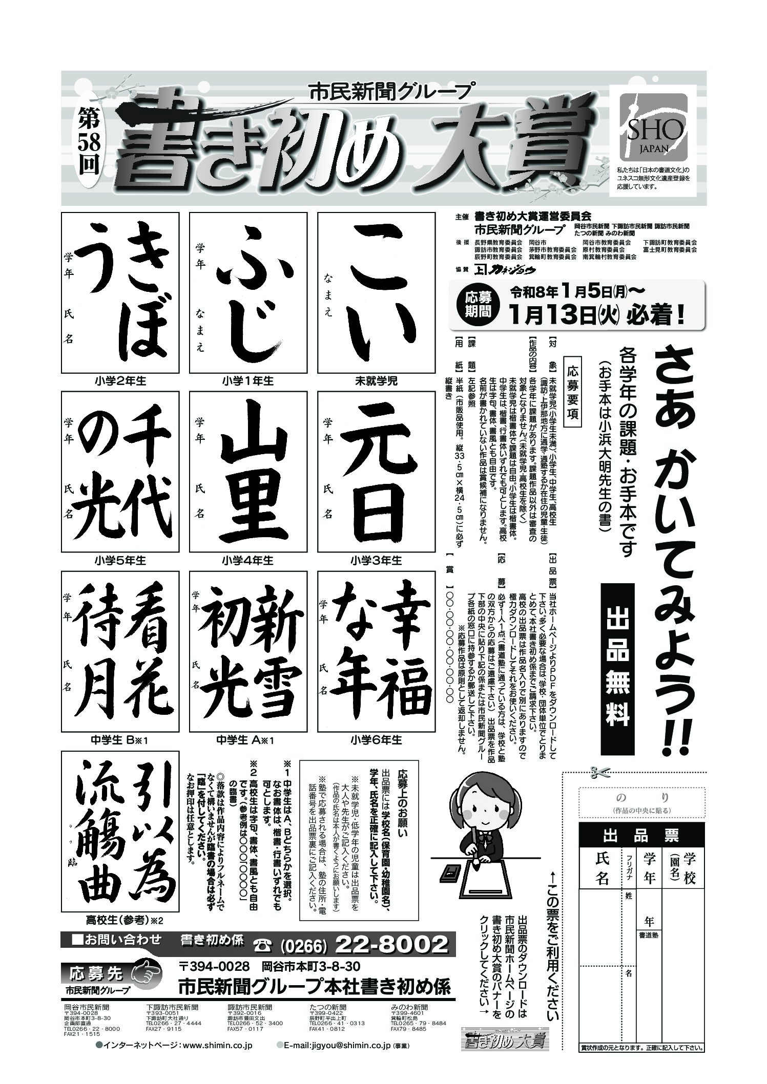 信州・市民新聞グループ5紙発刊エリア、および周辺圏域に在学、在住の園児、小中高校生を対象とした書道展【第58回書初め大賞】を開催いたします。 展示は全数展示で見ごたえある数が並びます。 ぜひ、ご応募、ご観覧ください。