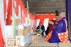 (写真は、㊧平福寺阿弥陀堂で祝詞を上げる五十嵐宮司、㊨正八幡宮で玉串を奉納する小林住職)