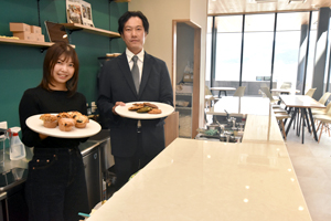 笠原大希さん(39)=諏訪市出身=と、妻・沙英さん(29)が19日(日)、岡谷市湊の諏訪湖畔に念願のカフェをオープンする。夫婦で小さな店をやろうと帰郷した矢先、新型コロナ禍に見舞われ、一時は諦めかけたが、大希さんが長年勤務した和洋菓子製造、販売のヌーベル梅林堂の中村文明社長に声をかけてもらったことで再起。同社がこの日に開業を予定する複合商業施設「諏訪湖テラス」に店を構え、2人は「家庭と職場に続くサードプレイス(第3の居場所)として、日常に花が咲く癒やしの空間にしていきたい」と意気込む。