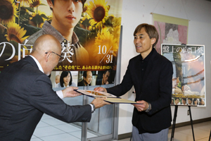 諏訪地域でも撮影された映画「盤上の向日葵(ひまわり)」が31日(金)、岡谷スカラ座(岡谷市中央町)をはじめ全国で一斉公開される。諏訪地方観光連盟は、「諏訪地方のロケーションが強く印象に残る」などとして同作品を「諏訪シネマズ」の第9号に認定し、14日に諏訪湖博物館・赤彦記念館(下諏訪町)で認定式を開催。熊澤尚人監督に、認定証を手渡した同連盟の宮坂徹副会長(下諏訪町長)は「重要なシーンに諏訪を選んでいただいた。映画と共に諏訪地方をPRしていきたい」と感謝した。