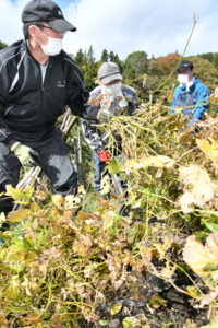 全てが順調に育った訳ではなく、豆腐の製造過程では捨てざるを得ない分も多い。更に連作できないことも知り、松澤社長は「中小の会社には十分な人出や資金もなく、6次産業の実現は厳しい」と消沈。下諏訪産豆腐の製造は「町内で作られた大豆を提供してもらえれば、可能性がない訳ではない。挑戦による学びは大収穫だった」と前を向いている。(写真は、大豆を収穫する松澤社長)