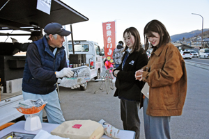 (写真は、小坂産のサツマ芋で作った焼き芋を購入する観光客=11月29日、湊湖畔公園で)