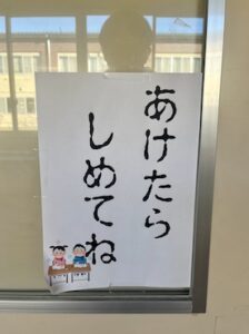 取材に訪ねたとある学校の張り紙。おどろおどろしいフォントが目に留まり、思わず撮影した。張られていたのは教室のドアの窓。開けっ放しにしないよう促す文言が、暖気が逃げた時の寒さを表現したように震えている。この字体を選んだ意図は聞くことができず分からずじまいだが…いずれにせよ効果はありそうだ。(武)