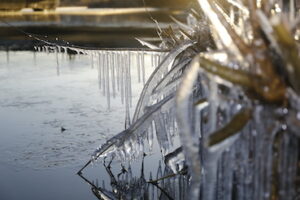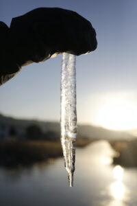 諏訪湖の湖面が凍ってせり上がる「御神渡り」の現地リポート。「小寒」から観察が続く諏訪市の舟渡川河口で21日、波しぶきを受けた岬に氷の芸術が出現した。さまざまな形のしぶき氷。現場に陽光が差す午前7時半ころ、透き通る氷がきらきらと輝き出す神秘的な瞬間をお裾分け。(井)