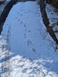 雪の日は憂鬱(ゆううつ)だ。市街地にも薄く雪が積もった1月の朝、余裕を持って家を出たはずが、予想以上に時間がかかっていら立ち、「退勤時までには解けてくれ」と念じていた。が、数時間後、点々と続く小さな足跡に心が躍り、単純な自分に笑えた。「解けずに残ってほしい」。なんて願いはかなわないので、写真に残すことにした。(田)