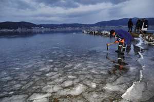 (写真は、全面結氷した湖面を氷斧で割る観察総代の伊藤さん)