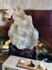 諏訪湖の湖面が割れてせり上がる「御神渡り」結果を伝える「注進状」揮毫(きごう)の取材で、八剱神社(諏訪市小和田)社務所入り口で大きな水晶の塊に出迎えられた。透き通った針山がびっしりと形成され、大地の神秘を感じるとともに清らかな気持ちになった。宮坂清宮司の言葉も飾られており、見どころ満載。御神渡りデザインの縁起物「絵馬」も授与されており、神社好きは参拝とともに見物してみては。(井)