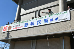 ミラノ・コルティナ冬季五輪のスピードスケート女子団体追い抜き(チームパシュート)で、下諏訪町出身の野明花菜選手(21)=立教大、岡谷南高出=らの日本チームが銅メダルを獲得した18日、町内は祝福ムードが広がった。地元選手の活躍に喜びの声が上がった。