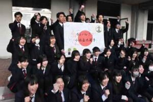 出来上がった寄せ書きは写真をメールで本人宛に送った上で、岡谷市の実家に届ける予定という。(写真は、多くの思いが込められた応援メッセージの寄せ書きと生徒たち)