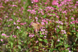 箕輪町の「赤そばの里」を訪ねると、たくさんのチョウが花から花へと飛び交っていた。画像検索の結果、撮影できたのは「ツマグロヒョウモン」。羽がボロボロになっている…