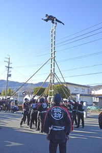 諏訪市消防団第5分団は1日、伝統のはしご乗りを諏訪大社上社本宮や豊田地区内5カ所で披露した。はしごの班員たちが地上7.5メートルの高所で妙技を繰り広げ、ことし…