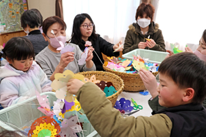 箕輪町北小河内の漆戸常会は、小正月伝統の「大文字」を11日(日)午前8時から漆戸のつじに建てる。4日に約40人が常会の集会所に集まり、さおに飾る色とりどりの花…