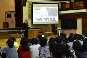 神明小学校は7日、創立60周年記念事業として、校歌を作曲した竹内邦光さん(88)=埼玉県=を同校に招いた。全校299人をはじめ、教職員や宮坂享教育長ら計約33…