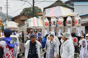 辰野町小野の矢彦神社の例大祭本祭りが5日にあり、伝統の屋台の曳行が小野や塩尻市北小野で行われた。地域の老若男女が3基の屋台を曳き、同神社に奉納。雨が降る中でも…