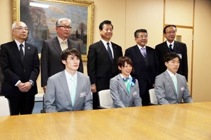 平昌冬季五輪で2個の金メダルを獲得したスピードスケートの高木菜那選手(25)=日本電産サンキョー、本社・下諏訪町広瀬町=が2日、町役場に青木悟町長ら町理事者を…